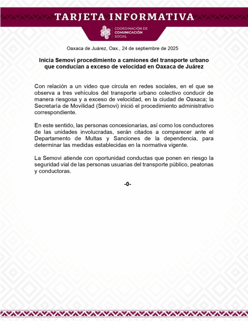 Con relación a un video que circula en redes sociales, en el que se observa a tres vehículos del transporte urbano colectivo conducir de manera riesgosa y a exceso de velocidad, en la ciudad de Oaxaca; la Secretaría de Movilidad (Semovi) inició el procedimiento administrativo correspondiente.